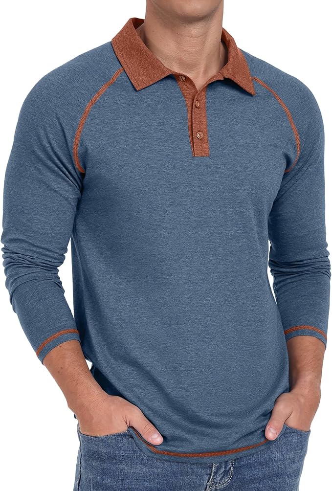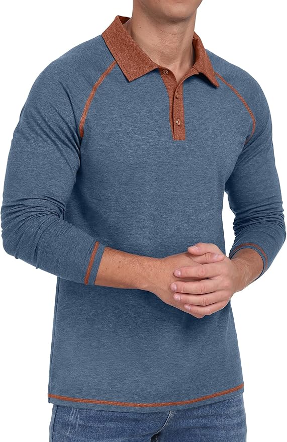 - Men’s raglan polo shirts features with polo collar, 3 button closure, subtle contrast stitching throughout, faux wood buttons, the contrasts will wake up denim and khakis.