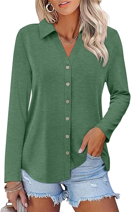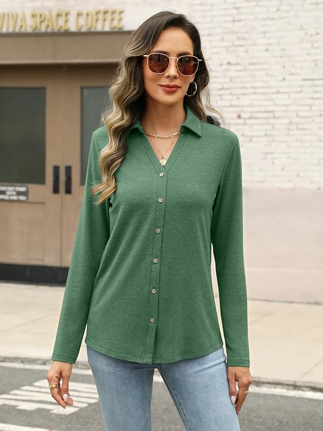 - Soft Material: Cotton, Polyester and Spandex. Soft Womens Tops: Cotton, Polyester and Spandex. The womens long sleeve button down shirts are made of soft, stretchy fabric and a roomy fit that keep you cool and cozy all day, not easily deformed
