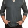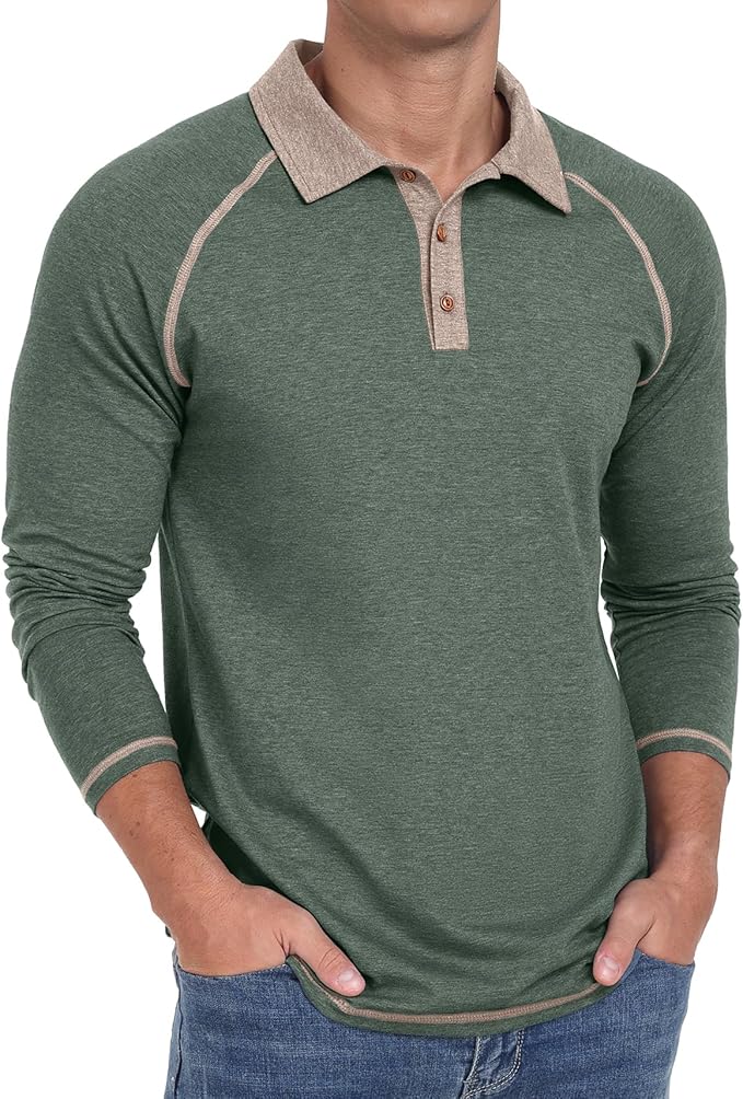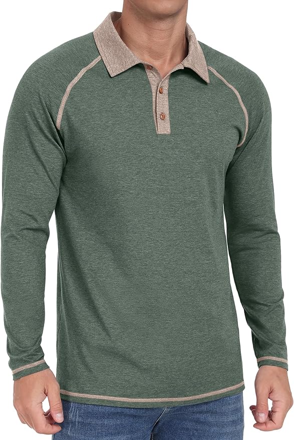 - Men’s raglan polo shirts features with polo collar, 3 button closure, subtle contrast stitching throughout, faux wood buttons, the contrasts will wake up denim and khakis.